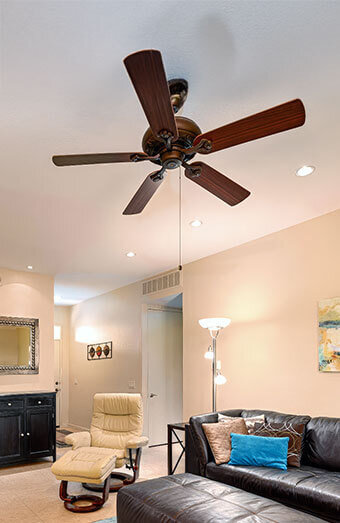 Professional installation of new ceiling fans in bedrooms, living rooms, patios and offices. Options include standard fans, modern low-profile designs and custom mounting heights.